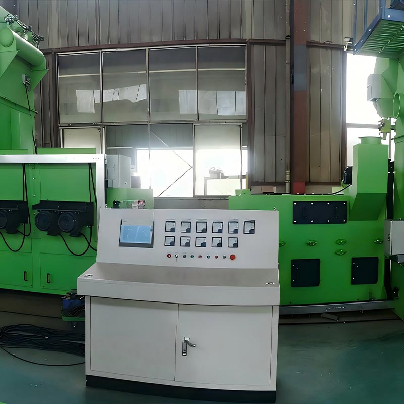 Os tijolos entram na câmara de jateamento através do sistema de transporte. A roda de jateamento projeta abrasivo em alta velocidade na superfície do tijolo, removendo impurezas e formando uma superfície áspera. Após a separação, o abrasivo é reciclado, e o pó é coletado e tratado, completando todo o fluxo de processamento.